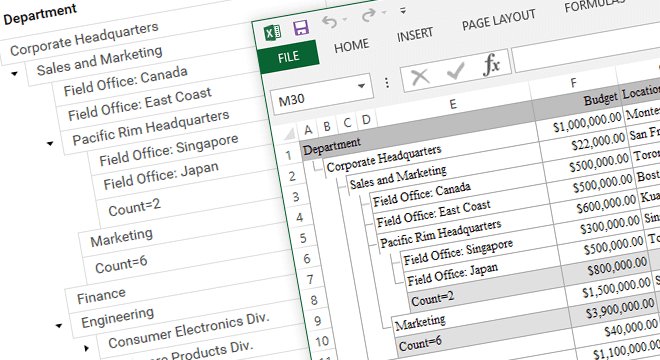 Our Tree List control provides custom style settings so you can paint individual data cells or entire nodes. In this animation, the TreeList's HtmlRowPrepared event is used to color rows green (if Location = Monterey) and the HtmlDataCellPrepared event handler is used to color Budget cells yellow (color brightness is based on a cell's value and those over one million use a bold font effect).