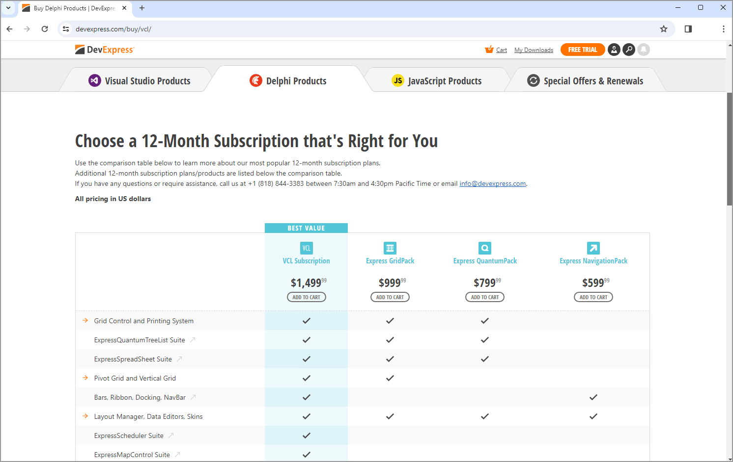 Select Visual Studio Products, Delphi Products, or JavaScript Products and review subscription comparison tables. You can add a product to your shopping cart by clicking a link in the table header.