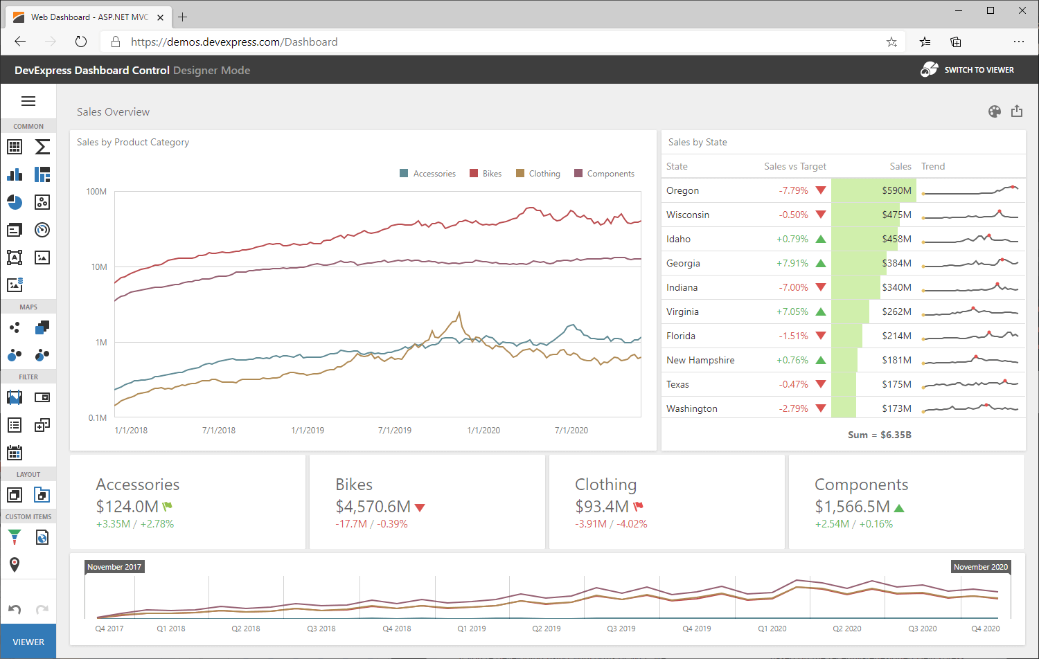 With DevExpress Dashboard for .NET, Angular, React and Vue, creating insightful and information-rich decision support systems for executives and business users across platforms and devices is a simple matter of selecting the appropriate UI widget (Chart, Pivot Table, Data Card, Gauge, TreeMap, Map, Grid or simple Filter elements) and dropping data fields onto corresponding arguments, values, and series.