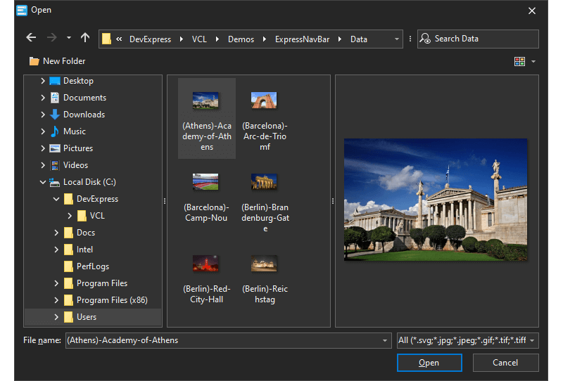 This release ships with new skinnable replacements for the standard VCL Open/Save Picture dialogs. Our dialogs can preview images from a number of different formats, including SVG.