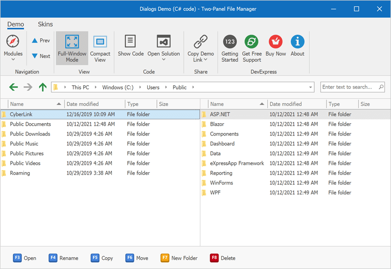 You can combine UI elements as needed. For example, you can display all three controls to emulate Windows Explorer or display two grid-based panels side-by-side (alongside the Address Bar) to replicate 3rd-party file managers like FAR and Total Commander.